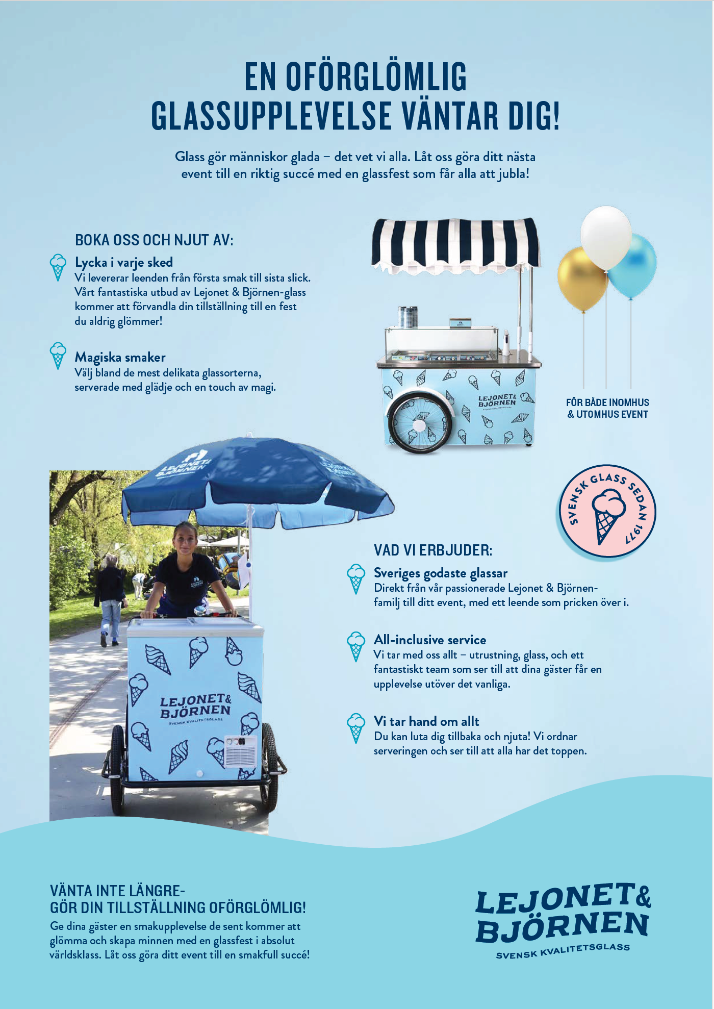 EN OFÖRGLÖMLIG UPPLEVELSE VÄNTAR DIG!Glass gör människor glada - det vet vi alla. Låt oss göra ditt nästa event till en riktig succé med en glassfest som får alla att jubla! BOKA EN OFÖRGLÖMLIG UPPLEVELSE!
